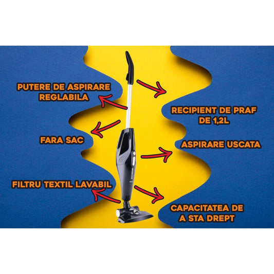 Aspirator vertical de mana HAUSBERG 2 in 1, fara sac, aspirare uscata, filtru textil lavabil, 1.2 l, 800 W