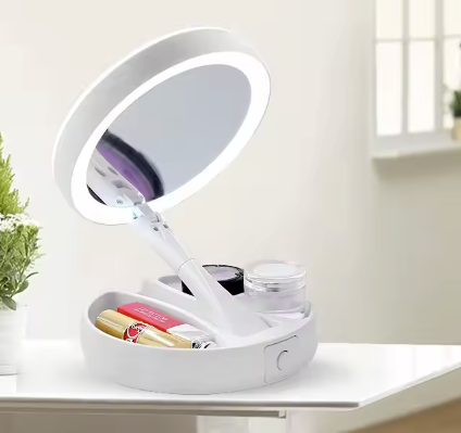Oglinda cu 2 fete, rotunda pentru machiaj cu iluminare LED, Pliabila, 25 cm, Efect de lupa