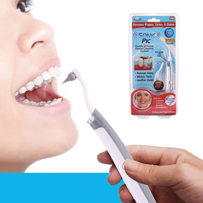 Dispozitiv de curatare dentara cu ultrasunete Sonic Pic si lumina LED reprezinta un aparat sub forma de periuta de dinti ce va ajuta sa curatati zonele greu accesibile din cavitatea bucala precum albirea si curatarea dintilor sau detartraj.