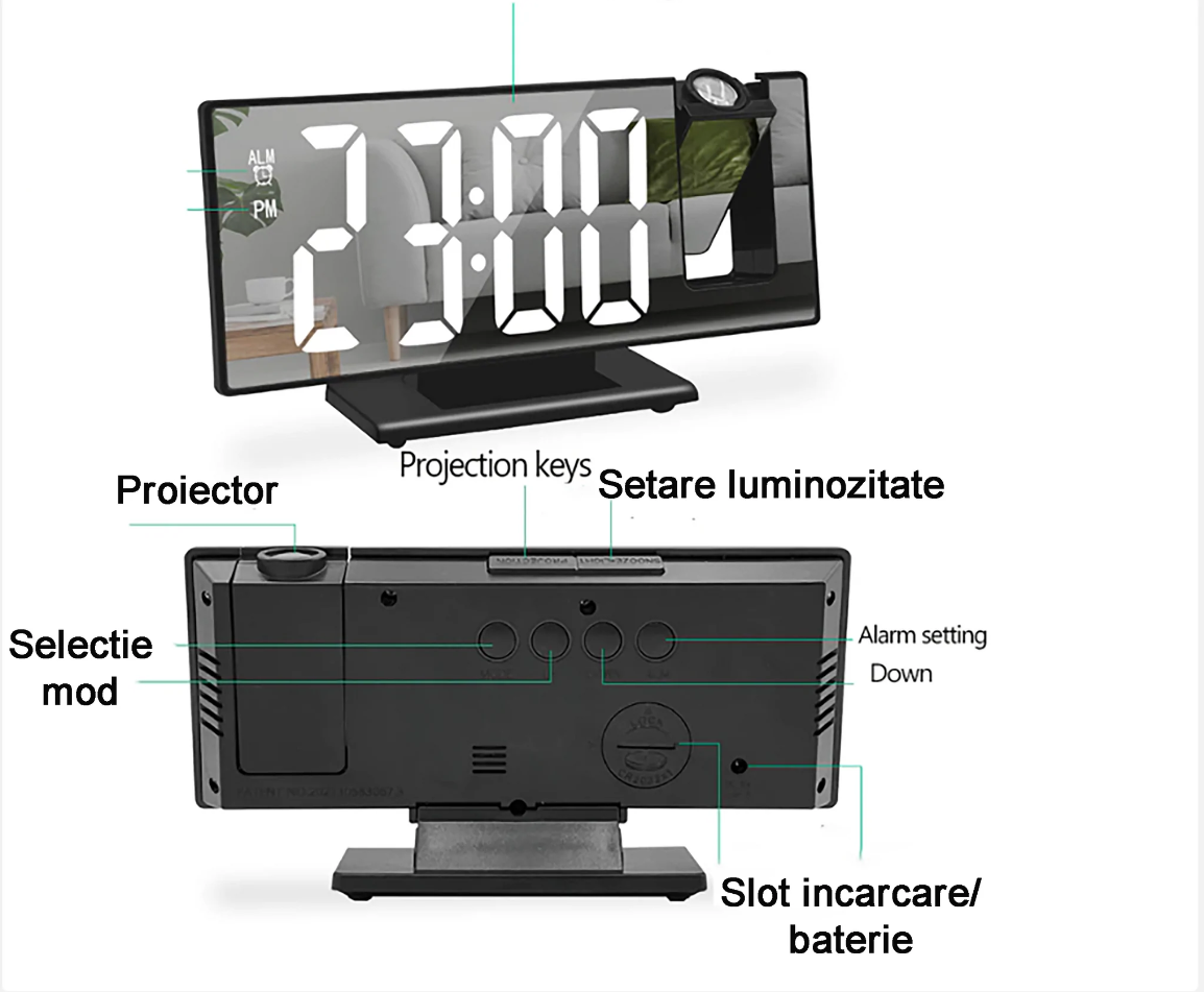 Ceasul de masa tip oglinda, ecran LED, afisare temperatura cu proiectie 3D