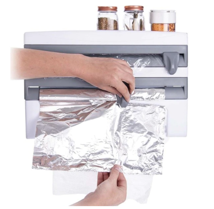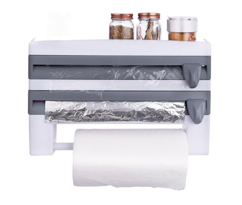 Deasupra dispenser-ului se pot pastra borcane de diferite dimensiuni. Suportul pentru prosoape de hartie se poate regla in functie de latimea sulului sau poate fi detasat complet.