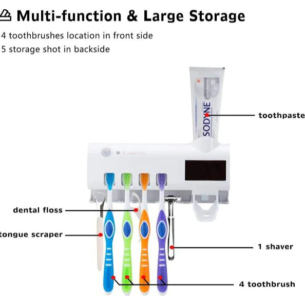 Potrivit pentru toata familia si economic: Suportul este proiectat pentru toata familia, astfel ca puteti pune pana la 5 periute de dinti, inclusiv electrice si o pasta de dinti. Cu ajutorul suportului cu sterilizator UV, pasta de dinti nu se risipeste, dispozitivul fiind prevazut cu un mecanism de dozare care elibereaza fix cat produs ai nevoie. Economic si igienic!