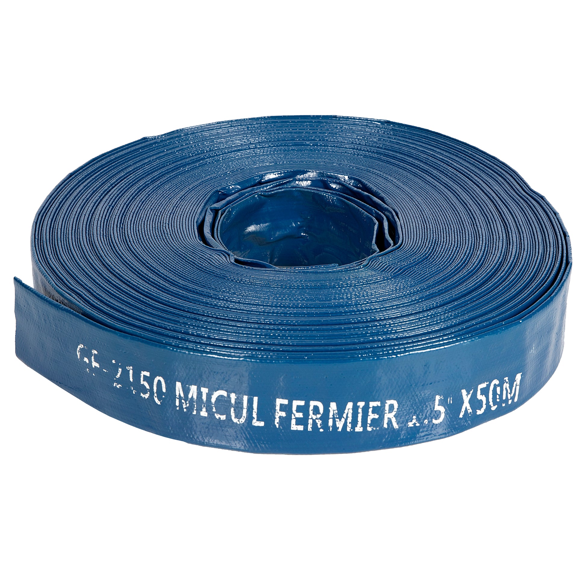 Furtunul plat din PVC, diametru 1,5", lungime 50 m, poate fi folosit in agricultura, in industrie, la irigatii, la transortul apelor reziduale, refulari.