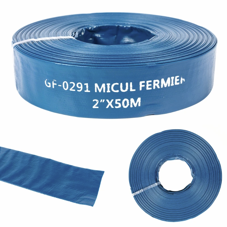 Furtunul plat din PVC, diametru 2", lungime 50 m, poate fi folosit in agricultura, in industrie, la irigatii, la transortul apelor reziduale, refulari.