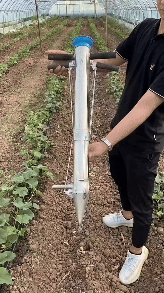 Plantatorul din inox cu 2 manere si pedala, se foloseste in special pentru plantarea rasadurilor de rosii, ardei, castraveti, vinete, pepene galben si rosu, a tuberculilor de cartofi dar si pentru seminte mai mari.