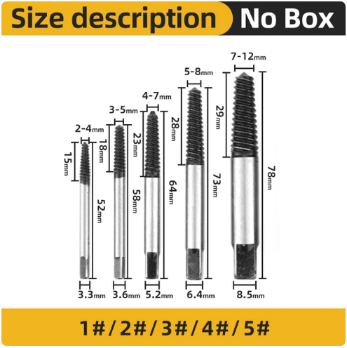 Setul 5 piese extractoare suruburi uzate, rupte este fabricat din otel HSS 4241, fiind ideal pentru indepartarea suruburilor, holdsuruburilor uzate, cu cap drept, cruce, stea, philips, hexagonal, torx, patrat etc.