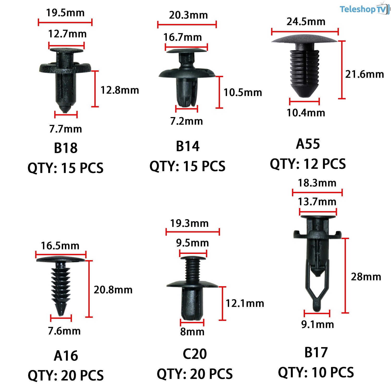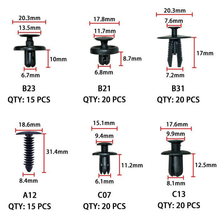 Setul contine elemente de diferite marimi si sisteme de prindere, clipsuri, cleme plastic pentru prindere interior sau exterior, auto sau moto, recomandate pentru reparatia tapiteriei, plafoanelor, fetelor de usi, prinderea carenajului sau a diverselor ornamente etc.