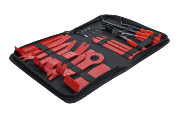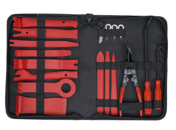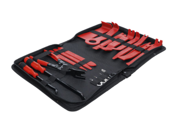 - 11 scule de demontare din plastic armat cu fibra de sticla in versiune cu fante, drepte si unghiulare, pentru demontarea mulajelor, a ochelarilor de oglinda, a capacelor si a panourilor in interior si de pe caroserie